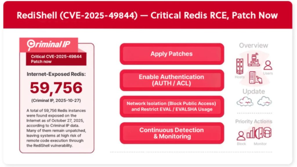 Các tổ chức nên nâng cấp lên các phiên bản Redis đã được vá cụ thể chống lại CVE-2025-49844 theo các thông báo bảo mật chính thức.