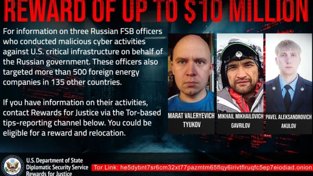 Chính phủ Hoa Kỳ đã công bố khoản tiền thưởng 10 triệu USD cho thông tin dẫn đến việc bắt giữ ba sĩ quan Cục An ninh Liên bang Nga (FSB). Các sĩ quan này bị cáo buộc thực hiện các tấn công mạng vào cơ sở hạ tầng trọng yếu của Hoa Kỳ và khai thác thiết bị mạng Cisco. Thông báo công khai này nhằm nâng cao nhận thức và khuyến khích bất kỳ ai có thông tin hữu ích hãy cung cấp.